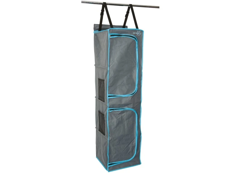 Een opvouwbare 4-vaks hangkast. Beschikt over 4 ruime vakken welke afgesloten kunnen worden met de oprolbare deurtjes. Eenvoudig en op diverse manieren te bevestigen. Zo kan deze organizer met de pees worden opgehangen aan een caravanrails, met het klittenband of met straps aan een tentstok of met de zeilogen aan haken. De lussen onderaan zorgen voor extra fixatie. Gemaakt van extra stevig 600D Two Tone polyester.