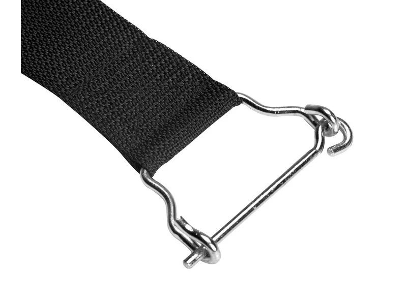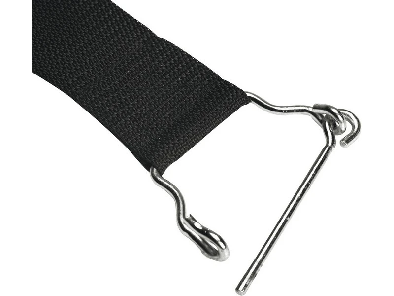 Een universele stormbandset. Geschikt voor voortenten uitgevoerd met clips. Set bestaande uit 2x nylon stormbanden van ieder 3,5 meter, 2x veren en 2x stormharingen. Het oog van de spanband is eenvoudig en universeel te bevestigen aan de clip van een tent.