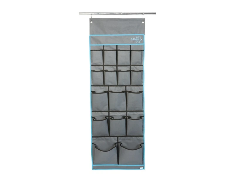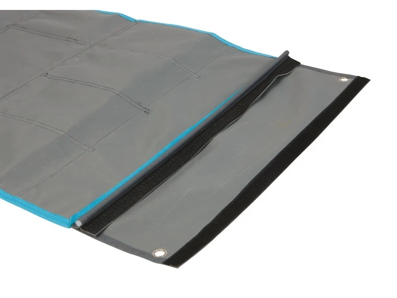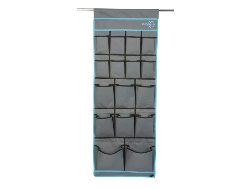 Een multifunctionele 16-vaks organizer. Beschikt over 2 ruime vakken, 6 medium vakken en 8 kleine vakken. Eenvoudig en op diverse manieren te bevestigen. Zo kan dit tentschort met de pees worden opgehangen aan een caravanrails, met het klittenband aan een tentstok of met de zeilogen aan haken. De lussen onderaan zorgen voor extra fixatie. Gemaakt van 420D nylon.