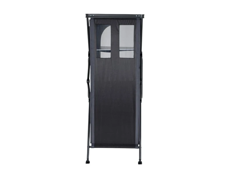 Een zeer stabiele en extra hoge leg/hangkast. Zeer eenvoudig op te zetten door een uniek systeem voor het in- en uitklappen van deze kast! Deze legkast beschikt over een grijs melamine hittebestendig en watervast oplegblad en een aluminium frame/beschermrand. De hoes is gemaakt van extra stevig 400 denier polyester met daarin 4 handige legplanken, aan de zijkant 4 vakken en een mesh raam aan de achterkant. De verstelbare poten zijn afzonderlijk af te stellen. De kast beschikt over speciale stabilisator voetjes zodat de legkast op iedere ondergrond stabiel staat. Inclusief kledingstang om van de legkast een hangkast te maken. De kast wordt geleverd in een draagtas.