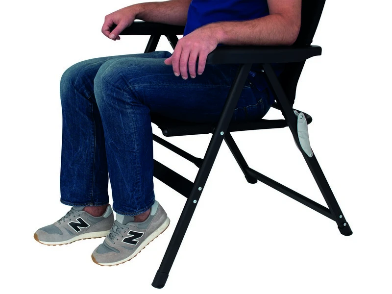 Nieuwe model campingstoel met uitschuifbaar hoofdkussen. De stof is van een ademend 3D-mesh met waterdoorlatend polyesterschuim. Sneldrogend, comfortabel en gemakkelijk in onderhoud. Het nieuwe ovale aluminium frame met epoxy coating laat zich eenvoudig inklappen tot handig formaat wat in bijna elke caravanbagage ruimte of kast past. Het uittrekbare hoofdkussen vermindert de inklap-hoogte met 13 cm. De stoel heeft een stevig aluminium scharnier en daarom een max. draagvermogen van 140 kg. Rugleuning is 7 x verstelbaar. Voetensteun optioneel leverbaar.