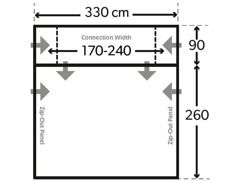 Vrijstaande tent, breedte 330 cm. Hoogte 220-300 cm.